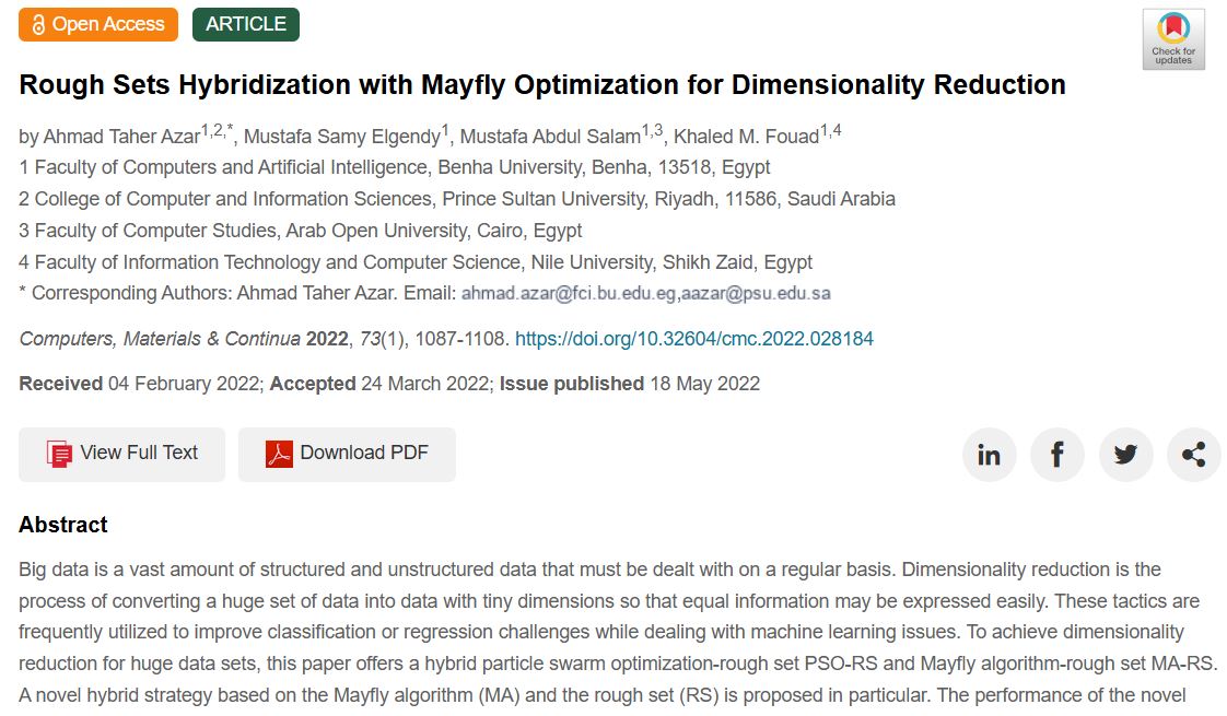 Big data is a vast amount of structured and unstructured data that must be dealt with on a regular basis. Dimensionality reduction is the process of converting a huge set of data into data with tiny dimensions so that equal information may be expressed easily. These tactics are frequently utilized to improve classification or regression challenges while dealing with machine learning issues. To achieve dimensionality reduction for huge data sets, this paper offers a hybrid particle swarm optimization-rough set PSO-RS and Mayfly algorithm-rough set MA-RS. A novel hybrid strategy based on the
