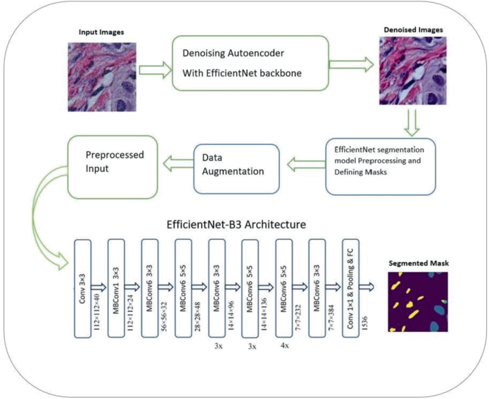 Machine Learning technologies are being developed day after day, especially in the medical field. New approaches, algorithms and architectures are implemented to increase the efficiency and accuracy of diagnosis and segmentation. Deep learning approaches have proven their efficiency; these approaches include architectures like EfficientNet and Denoising Autoencoder. Accurate segmentation of nuclei in histopathological images is essential for the diagnosis and prognosis of diseases like cancer. In this paper, we propose a novel method for semantic segmentation of nuclei using EfficientNet and