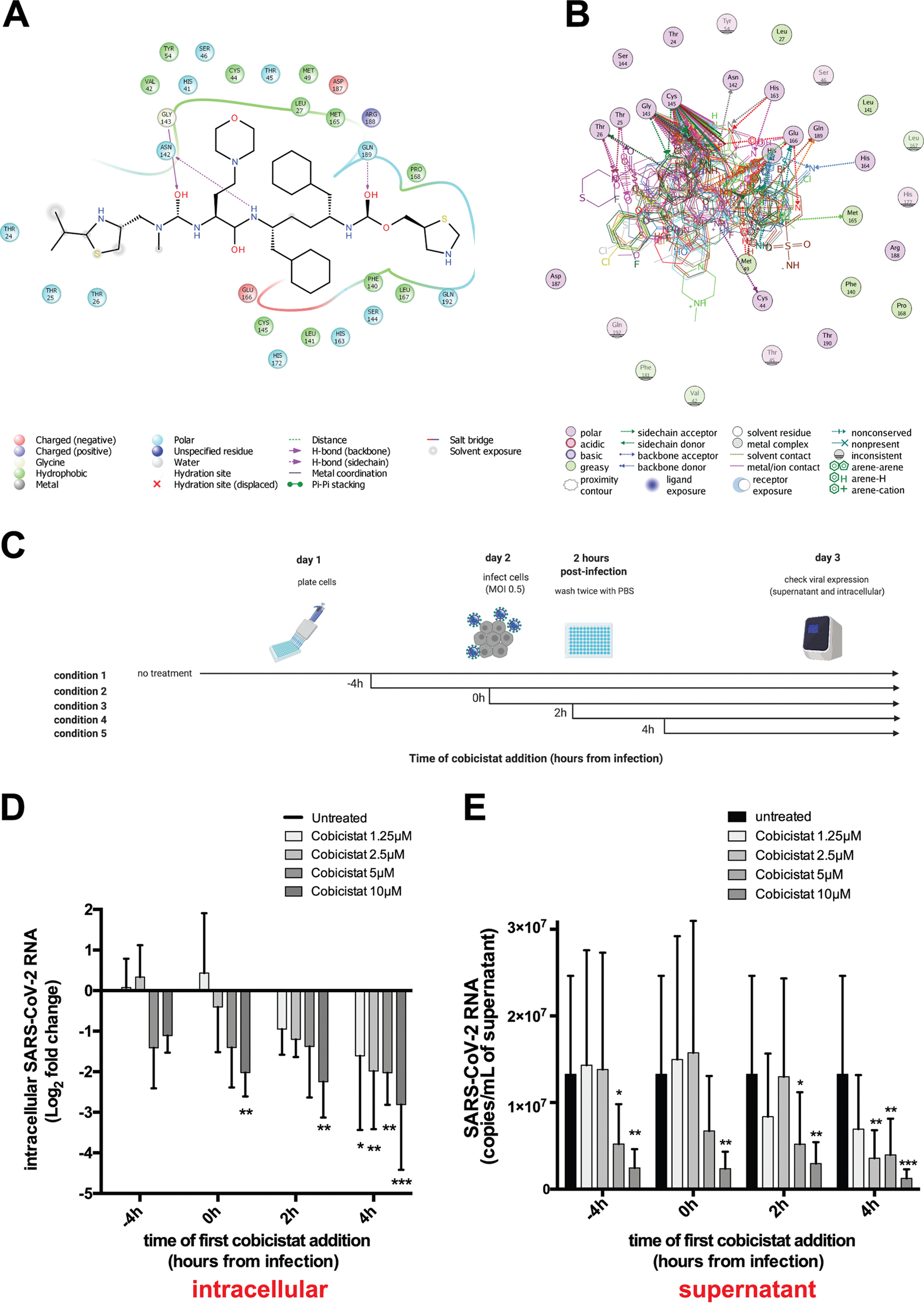 Combinations of direct-acting antivirals are needed to minimize drug resistance mutations and stably suppress replication of RNA viruses. Currently, there are limited therapeutic options against the severe acute respiratory syndrome coronavirus 2 (SARS-CoV-2), and testing of a number of drug regimens has led to conflicting results. Here, we show that cobicistat, which is an FDA-approved drug booster that blocks the activity of the drug-metabolizing proteins cytochrome P450-3As (CYP3As) and P-glycoprotein (P-gp), inhibits SARS-CoV-2 replication. Two independent cell-to-cell membrane fusion